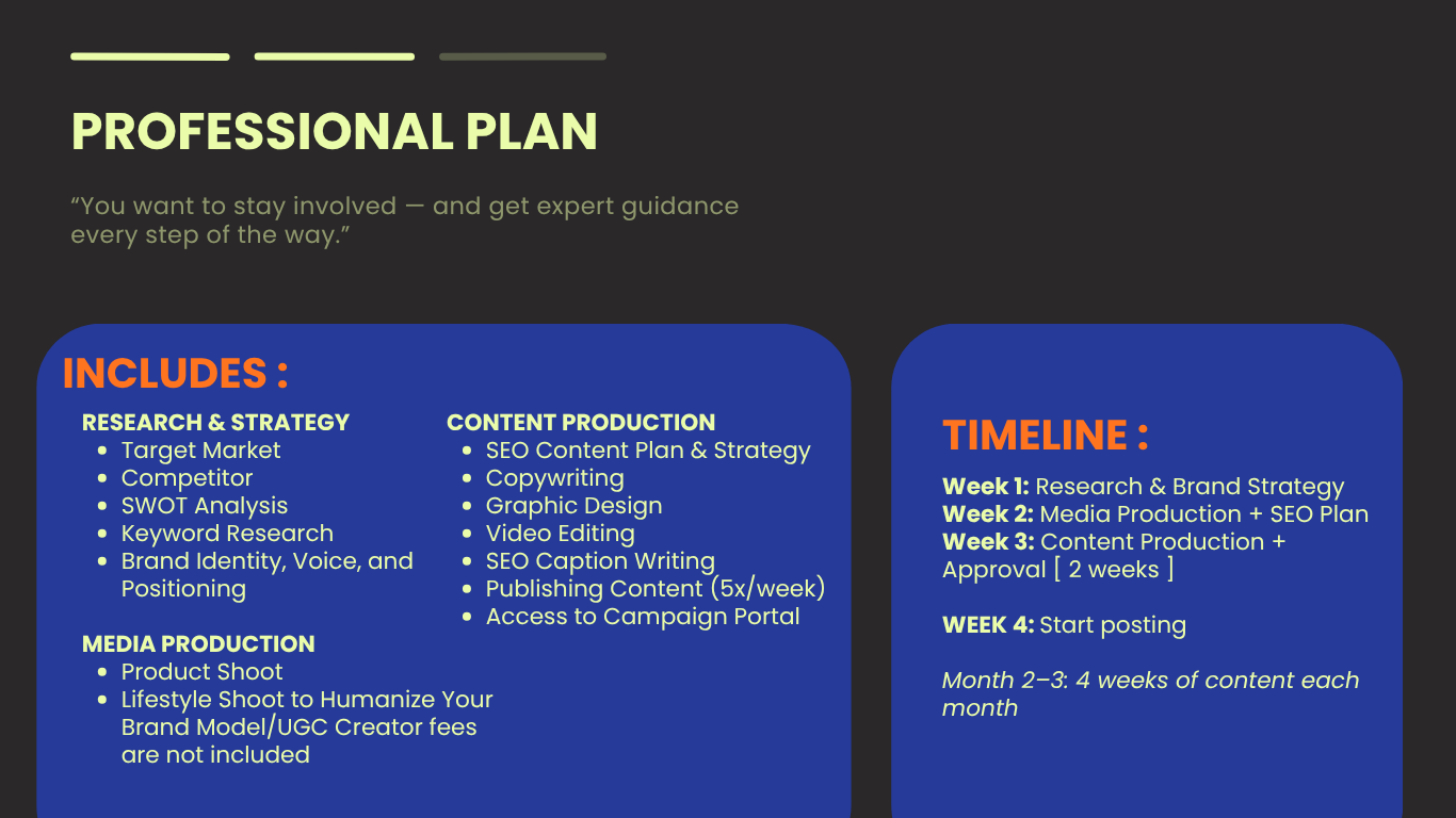 Ideal for brands that need complete help β from research and strategy to photo/video production and content execution.
